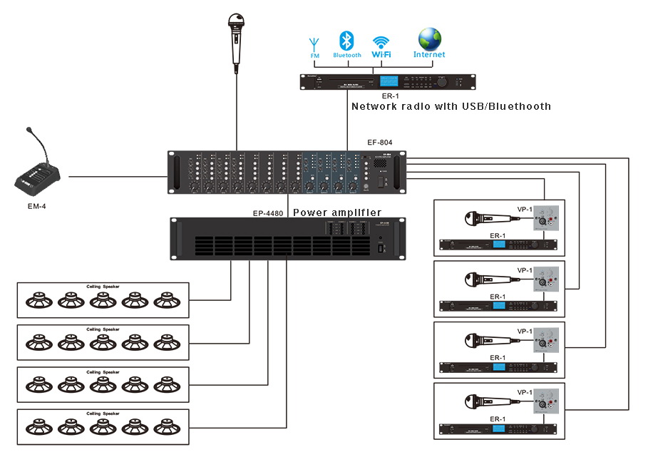 ◆ 4 XLR Balanced jack and 1/4” phone jack for CH1-4 input