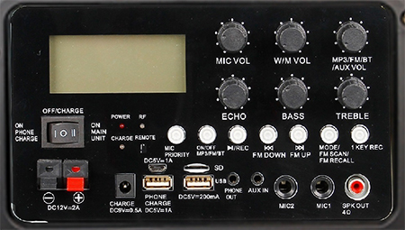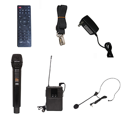 Input:  USB/Micro SD (TF) slot input, 1 AUX input, 2 wired MIC input, 2 wireless MIC input