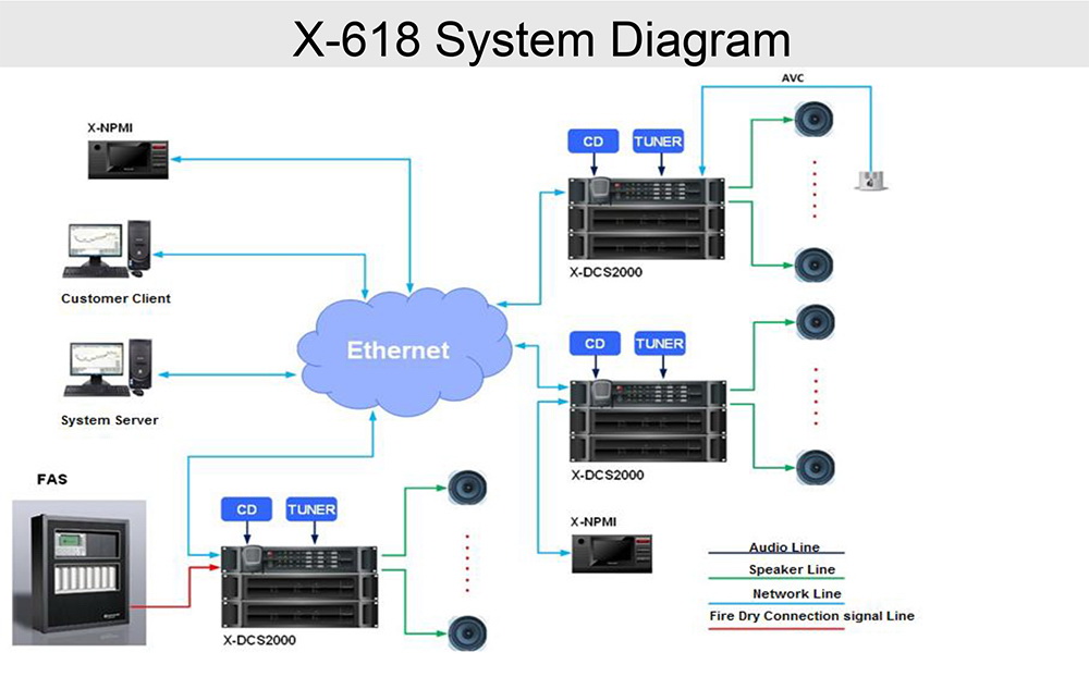 X-DCS2000/EN Digital Integrated System Manager (abbr. DCS) is the basic unit of X-618 Public Address and Voice Alarm System. DCS integrates plentiful functions such as zone expansion, multiple audio sources support, audio file storage, net audio, broadcasting, zone control, monitoring, fault diagnosis etc. The supplied X-SMART management software allows users to easily and efficiently manage and control the system.